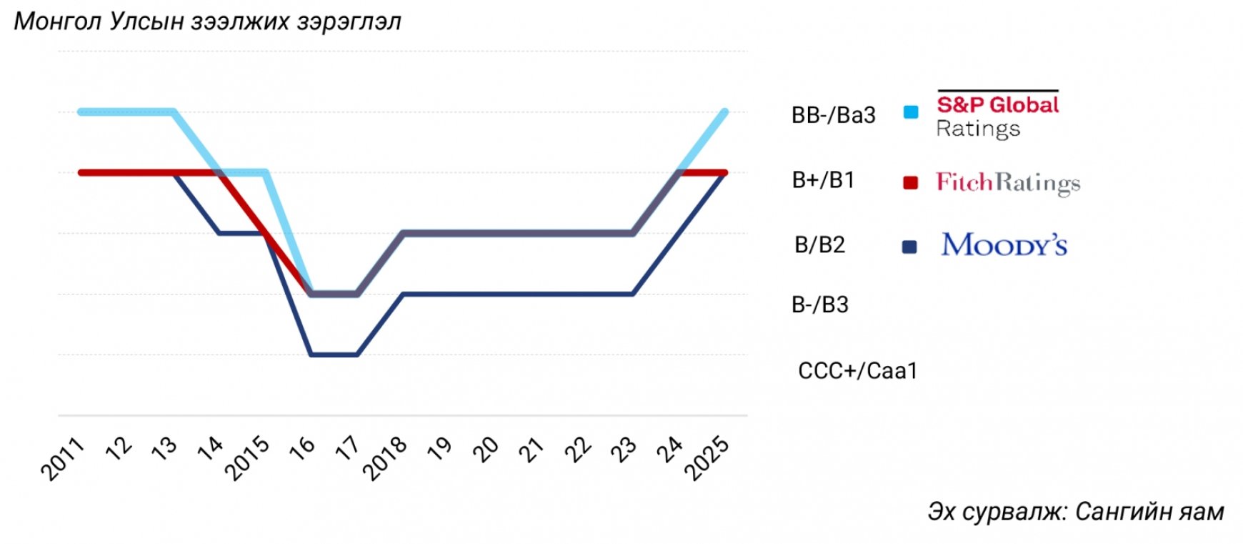 Олон улсын зээлжих зэрэглэл тогтоогч S&P агентлаг Монгол Улсын зээлжих зэрэглэлийг "В+"-ээс "ВВ" түвшинд, төлвийг "Тогтвортой” болгон ахиулсан нь сүүлийн 13 жилийн дээд үзүүлэлт болж байна. Мөн Moody’s агентлаг манай улсын зээлжих зэрэглэлийг “В1” түвшинд хүргэж хоёр дахь жилдээ ахиуллаа. Зээлжих зэрэглэлийг хоёр жил дараалан дээшлүүлэхэд Монгол Улсын макро эдийн засгийн тогтвортой байдал, гадаад төлбөрийн чадварын ахиц, эдийн засгийн тогтвортой өсөлт, төсвийн болон гадаад өрийн оновчтой бодлого голлон нөлөөлөв. Зээлжих зэрэглэлийн үнэлгээ сайжирсан нь Монгол Улсын Засгийн газар болон дотоодын аж ахуйн нэгж, байгууллагуудын зэрэглэл сайжрах боломжийг бүрдүүлж, дэлхийн санхүүгийн зах зээлээс таатай нөхцөлөөр санхүүжилт босгох боломжийг нэмэгдүүлж байна.